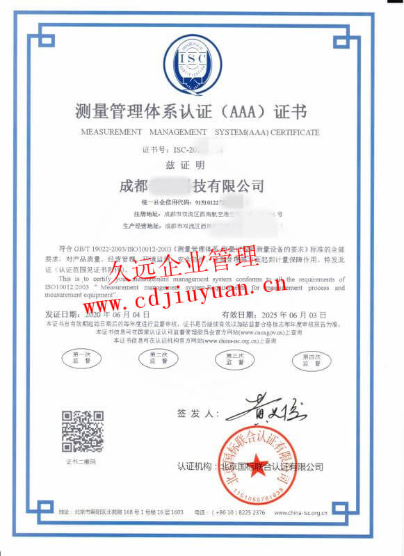 測量管理體系認(rèn)證證書